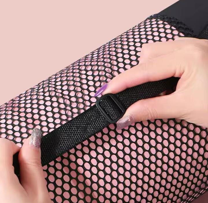 Bolso mat de yoga con diseño de malla en el medio para mantener el mat de yoga ventilado y con un diseño de cierre de cordón que permite abrir y cerrar el bolso con facilidad.