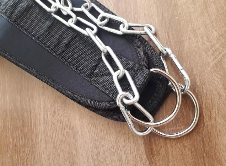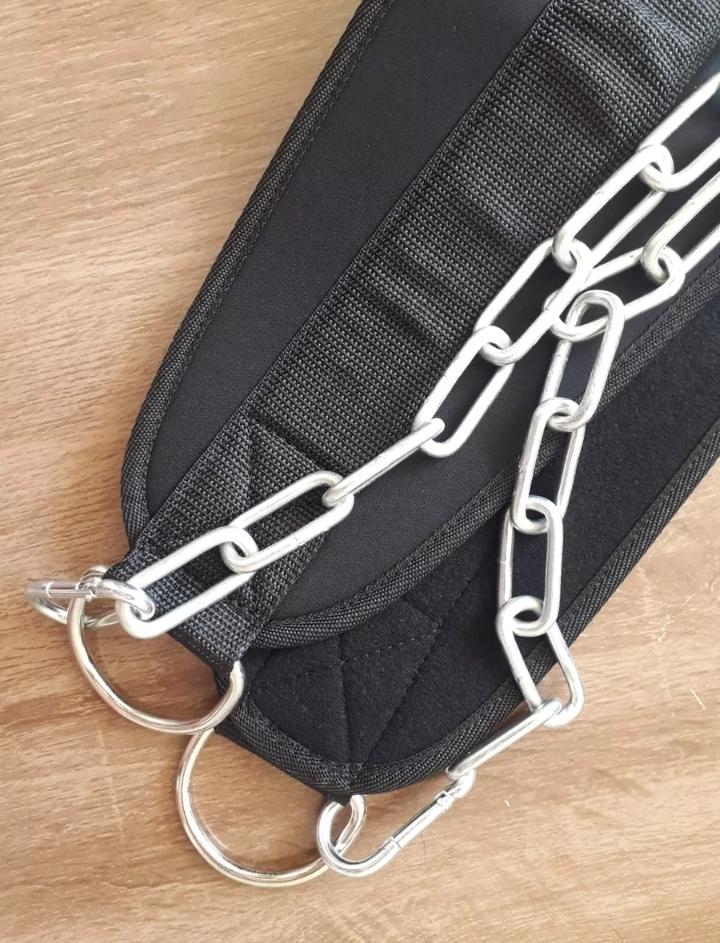 El Cinturón de Lastre está equipado con dos anillos en forma de D de acero cromado. Su estructura no tiene aberturas, por lo que no presenta problemas de sellado incluso cuando se utiliza con cargas importantes. El Dip Belt está equipado con una cadena de acero inoxidable galvanizado de pequeño tamaño, cerrada con un mosquetón de acero resistente compatible con orificios de discos olímpicos. La longitud de la cadena permite trabajar con discos como Bumpers con un diámetro de 450mm.